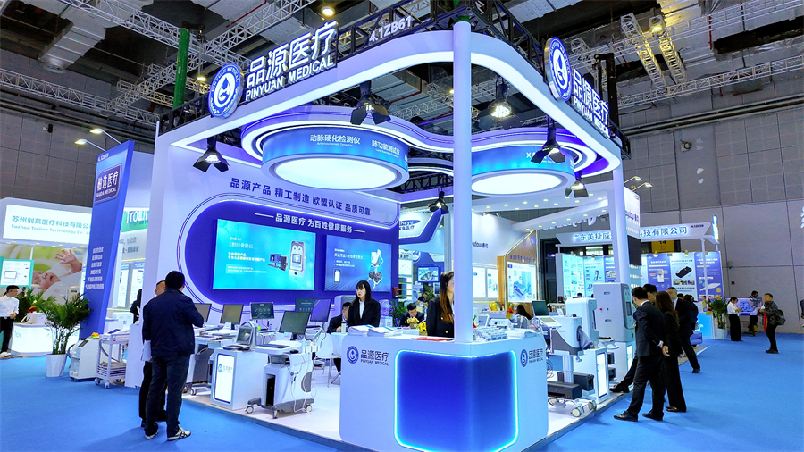 品源醫療本次展位設計簡約專業、布局清晰,劃分為產品展示區、體驗互動區、商務洽談區三大功能區域,五大系列產品整齊陳列,全方位展現品牌技術實力與臨床應用價值。