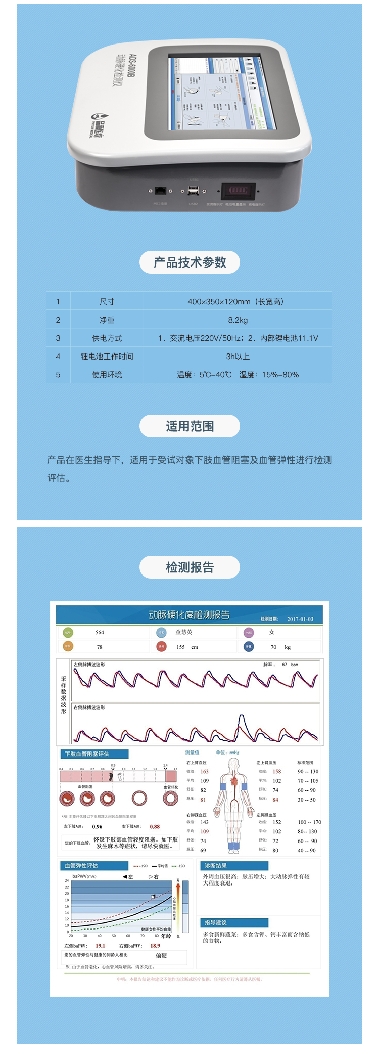 適用范圍:產品在醫生指導下,適用于受試對象下肢血管阻塞及血管彈性進行檢測評估。
